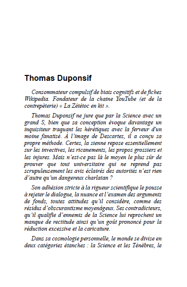 - Roch-Alain Fornacci, CEO chez Verbalicious« Un ouvrage fondamental. Pionnier. Injustement ignoré par les grands médias (et les petits aussi). Ce livre devrait être remboursé par la Sécu. On y trouve tout : humour, philosophie, ambition démesurée. Bref, un miroir fidèle de son auteur.»